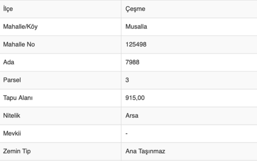 Location: Musalla Mah Features: Nearby Çeşme Centre Total square meters: 1.104 M2 Land details: Ada: 8014 Parsel: 9