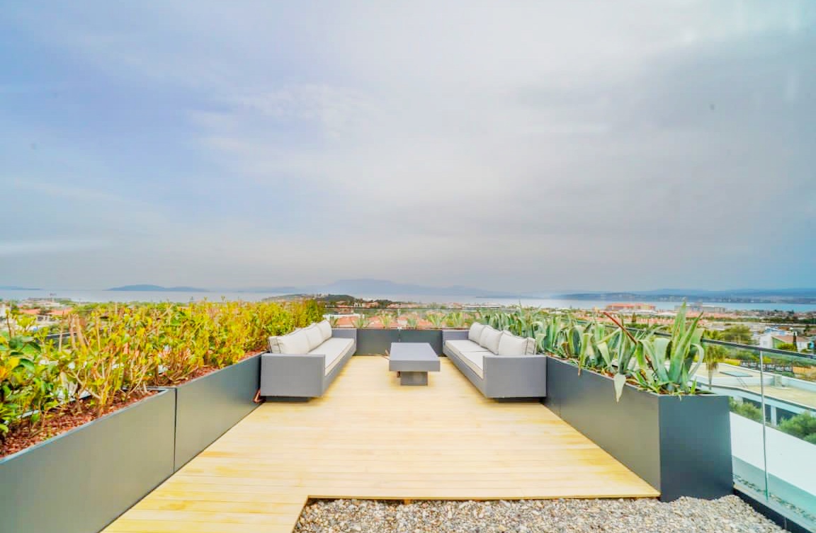 The beautifully landscaped garden path leads to a staircase on the side of the property, this staircase will bring you to the roof-terrace with 360 degree views over whole Çeşme.