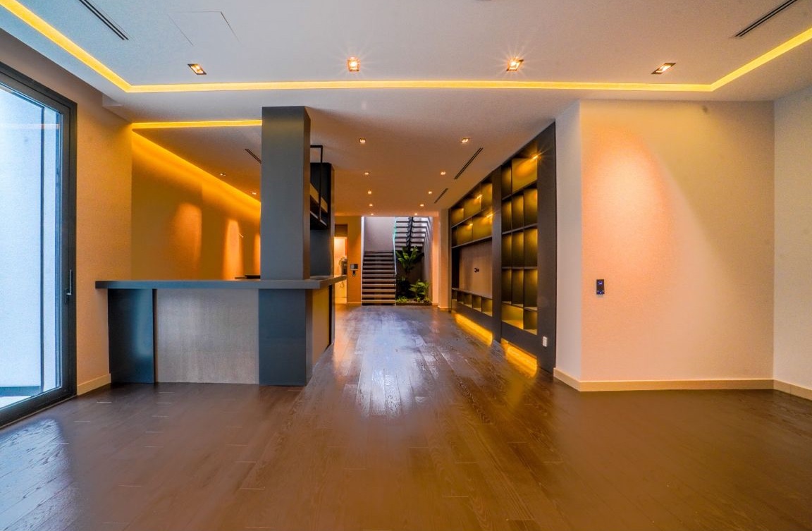 Downstairs a spacious entertainment room with open-air courtyard and a hotel quality bar is made. This floor is perfectly suitable to create and extra living room or cinema room. Another 2 bedrooms are situated on this floor.